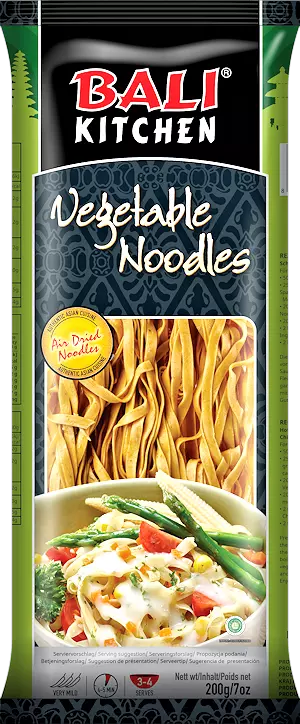 Bali Kitchen Vegetable Noodles are no ordinary noodles because of their vegetable content, giving them a mild flavour and a splash of colour. They are easy to use and delicious in any soup or stir fry application.